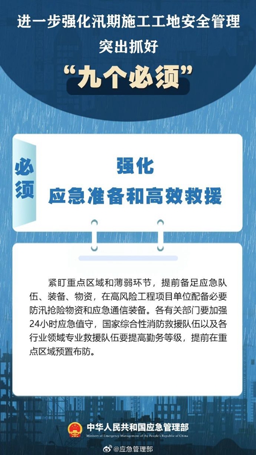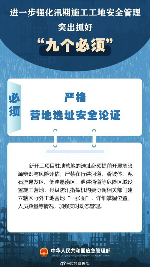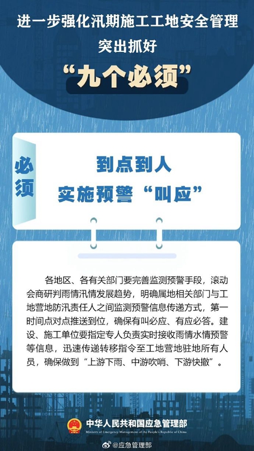 7月9日,國家防災減災救災委員會辦公室印發(fā)緊急通知,進一步強化汛期施工工地安全管理,要突出抓好“九個必須”↓↓ ???