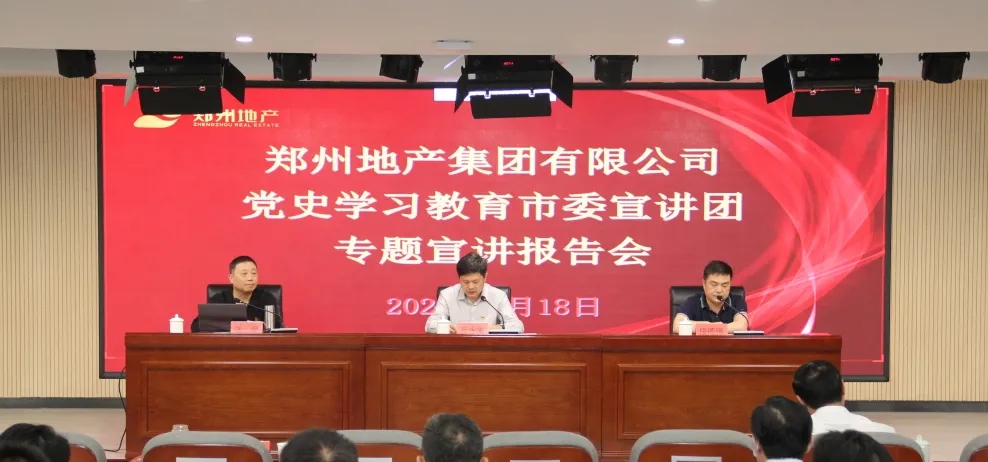 為持續(xù)推進(jìn)黨史學(xué)習(xí)教育走深走實(shí),5月18日上午,鄭州市委宣講團(tuán)走進(jìn)鄭州地產(chǎn)集團(tuán),在集團(tuán)301多功能廳開(kāi)展黨史學(xué)習(xí)教育專題宣講報(bào)告會(huì)。報(bào)告會(huì)由鄭州市委宣講團(tuán)成員、鄭州工程技術(shù)學(xué)院馬克思主義學(xué)院副教授張豪主講,市國(guó)資黨史學(xué)習(xí)教育第二巡回指導(dǎo)組組長(zhǎng)、四級(jí)調(diào)研員段德強(qiáng),指導(dǎo)組成員張?jiān)娪辍㈥愊殪车綍?huì)巡聽(tīng)旁聽(tīng),地產(chǎn)集團(tuán)領(lǐng)導(dǎo)班子、總部全體員工,各子公司支部書(shū)記、黨建部門負(fù)責(zé)人等共計(jì)150余人參加現(xiàn)場(chǎng)報(bào)告會(huì),各子公司員工共計(jì)170余人通過(guò)線上直播進(jìn)行觀看,會(huì)議由地產(chǎn)集團(tuán)黨委書(shū)記、董事長(zhǎng)萬(wàn)永生主持。