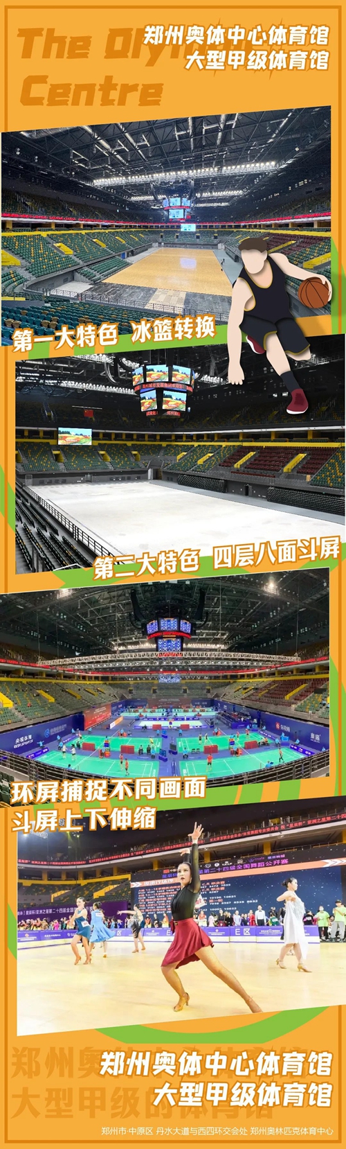 鋪上高規(guī)格的木地板結(jié)合場地正中央懸掛的四層八面斗屏,就是舉辦一場NBA比賽也是沒有問題。如果遇到大型商業(yè)活動(dòng)需求時(shí),場地空間可靈活轉(zhuǎn)換,可以根據(jù)需求布置成舞臺(tái)使用,體育館采用了地源熱泵供暖制冷系統(tǒng),相比傳統(tǒng)的中央空調(diào)節(jié)能了30%-40%。在體育館的鋼結(jié)構(gòu)頂棚施工中,采用了獨(dú)特的“跨混凝土結(jié)構(gòu)累積滑移”工藝,這項(xiàng)工藝榮獲了河南省工程建設(shè)科學(xué)技術(shù)獎(jiǎng)科技創(chuàng)新特等獎(jiǎng)。體育館作為大型甲級(jí)的場館不僅可承接一些商演等活動(dòng)也可承接國際A級(jí)單項(xiàng)賽事和國內(nèi)綜合性運(yùn)動(dòng)會(huì)等。