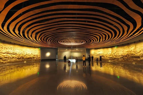 鄭州商代都城遺址博物院坐落于鄭州市市中心,序廳鏤空的洛陽鏟造型,寓意鄭州商代都城是一座由考古發(fā)現(xiàn)的千年王都。巨幅環(huán)形浮雕講述先商和商代故事。地面投影與年輪頂飾上下呼應,寓意鄭州古今同地,歷史文化一直延續(xù),3600余年的歷史有其根源,數(shù)千年的繁華有本可依。