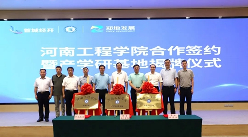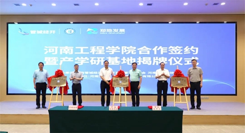 會(huì)上,河南工程學(xué)院、管城經(jīng)濟(jì)技術(shù)開發(fā)區(qū)管理委員會(huì)、河南鄭地產(chǎn)城融合建設(shè)發(fā)展有限公司共同簽署產(chǎn)學(xué)研合作協(xié)議,并現(xiàn)場(chǎng)為河南工程學(xué)院校外實(shí)習(xí)基地、產(chǎn)學(xué)研合作基地、就業(yè)基地揭牌。