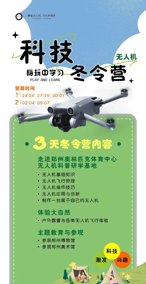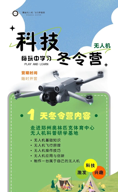 鄭州奧體翼能無人機研學基地是集無人機科普、研學、開發(fā)、應(yīng)用、賽事運營的綜合服務(wù)平臺,不僅擁有1000余平方米的無人機科普教育基地,還擁有無人機駕駛執(zhí)照的培訓資格。寒假期間,依托鄭州奧體中心開闊場館,翼能無人機將科普知識與實操表演完美結(jié)合,分別開設(shè)1至5天不等的科技冬令營,代領(lǐng)孩子們放飛科技夢,在嗨玩中學習。