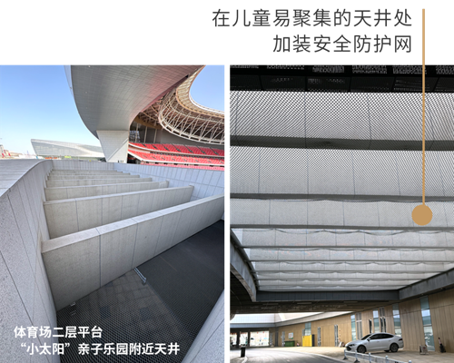 快樂成長(zhǎng),安全為先。為了確保兒童游樂區(qū)的安全,鄭州奧體中心從細(xì)節(jié)處著手精心加裝了多種防護(hù)裝置,在奧體中心西北角區(qū)域加裝隔離花箱、石墩,確保行人與機(jī)動(dòng)車分離。同時(shí),在體育場(chǎng)二層平臺(tái)兒童聚集較多的天井內(nèi),加裝防護(hù)網(wǎng);在健身器材一側(cè)加裝防護(hù)欄;在通往二層平臺(tái)的步梯兩側(cè)加裝防滑球......這些防護(hù)裝置均經(jīng)過嚴(yán)格的現(xiàn)場(chǎng)論證和質(zhì)量檢測(cè),確保其具有優(yōu)異的耐用性和穩(wěn)定性。通過這些措施,鄭州奧體中心致力于為孩子們打造一個(gè)既充滿樂趣,又安全無虞的游樂環(huán)境。