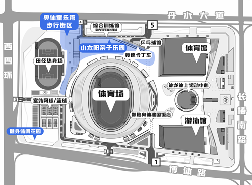 奧體童樂灣步行街區(qū)西鄰田徑訓(xùn)練場(chǎng),適合開展足球、慢跑、飛盤等親子運(yùn)動(dòng),南側(cè)配備有“奧體便民共享便利店”和衛(wèi)生間,向東可直達(dá)體育場(chǎng)二層平臺(tái)的“小太陽(yáng)”網(wǎng)紅打卡地,不僅視野開闊,能一覽各場(chǎng)館建筑風(fēng)貌,還配備了攀爬架、沙坑、秋千等兒童玩樂項(xiàng)目。