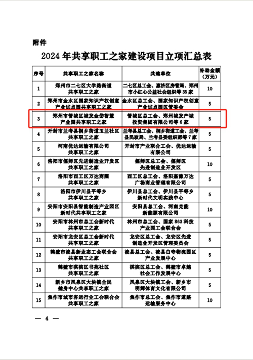 近日,河南省總工會(huì)發(fā)布《關(guān)于2024年共享職工之家建設(shè)項(xiàng)目立項(xiàng)的通知》,決定對(duì)城發(fā)金岱智慧產(chǎn)業(yè)園共享職工之家等32個(gè)共享職工之家建設(shè)項(xiàng)目進(jìn)行立項(xiàng),并對(duì)城發(fā)金岱智慧產(chǎn)業(yè)園共享職工之家給予資金補(bǔ)助,鄭州市僅有三家職工之家獲得立項(xiàng),這是城發(fā)金岱智慧產(chǎn)業(yè)園共享職工之家建設(shè)運(yùn)營后取得的第一份殊榮。