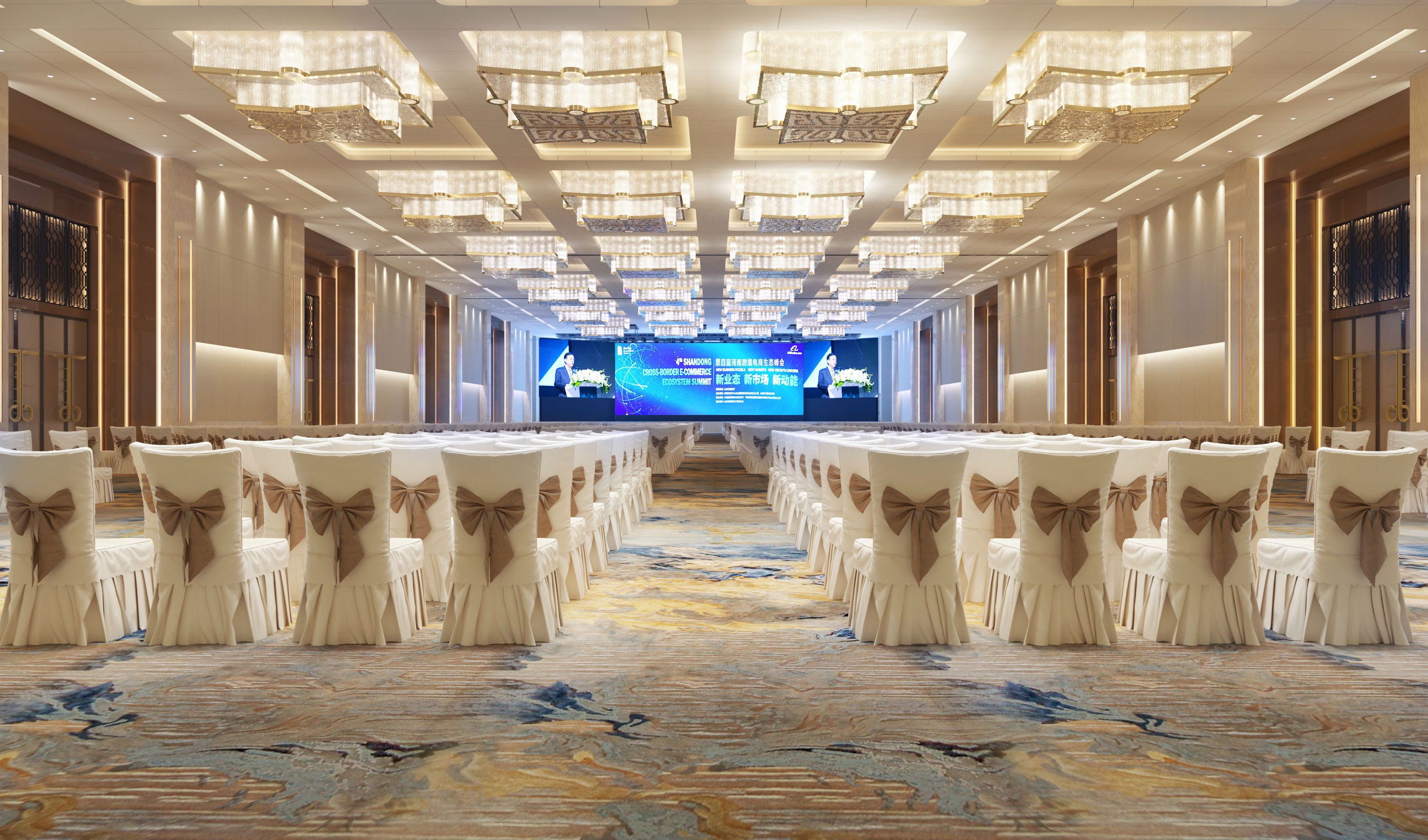 奧體中心展覽廳位于鄭州市奧林匹克體育中心游泳館下方,緊鄰鄭州“四個中心”中央大街,總建筑面積約8500平方米,包含3000平方米展覽廳、大堂前廳、設(shè)備房等配套設(shè)施工程。項(xiàng)目整體設(shè)計理念取“黃河天水”及“商合”之意,采用了大量的“黃河”及“商都”兩大彰顯地域特色的設(shè)計元素,表現(xiàn)出韻味十足的鄭州商都文化特色,同時又兼具現(xiàn)代會展會務(wù)的簡約風(fēng)格。